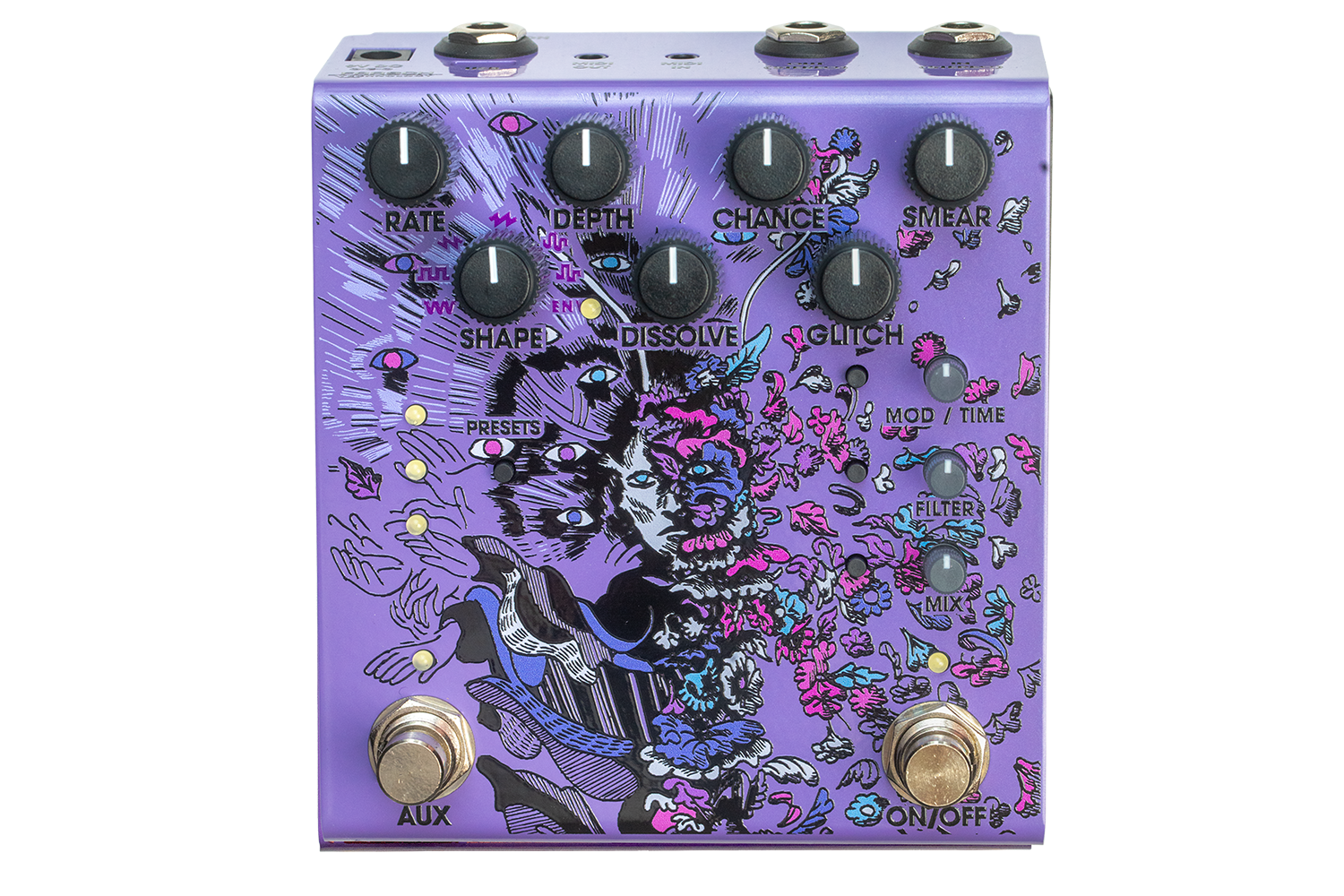Tactile switches to set modulation type (tremolo or vibrato), filter type (low pass or high pass), and mix type (standard or modified)